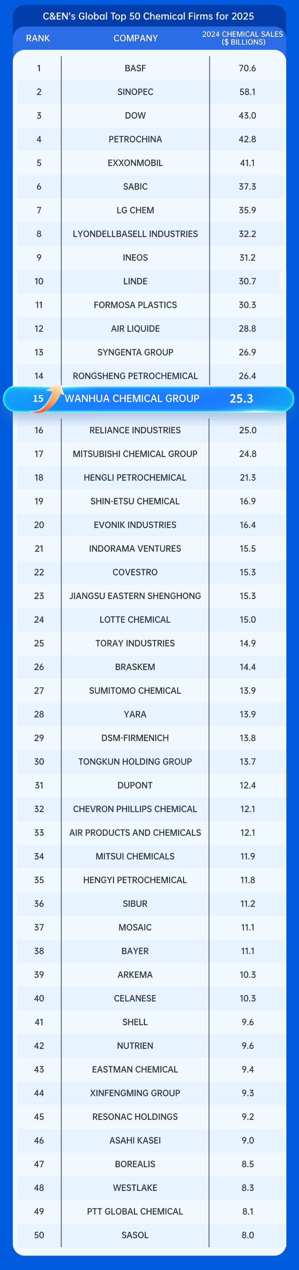 z6人生就是博化学位列C&EN全球化工企业50强第15位!